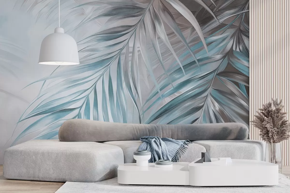 Wall murals Palm leaves with gray and blue tones, light textured background with soft colors, elegant tropical style Nr. w09475v1
