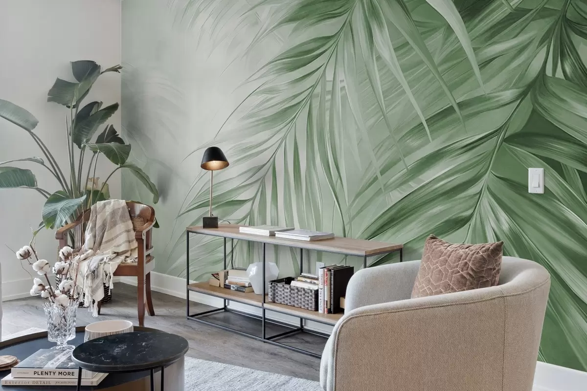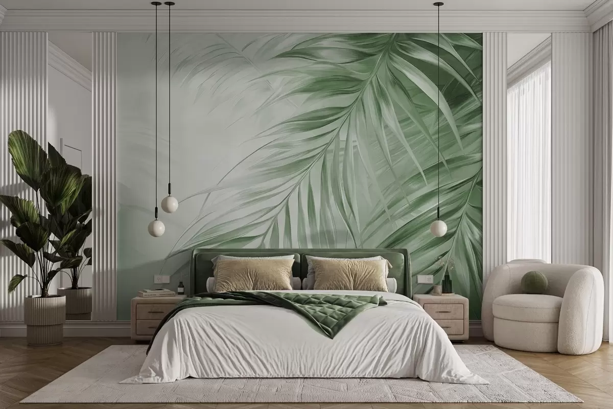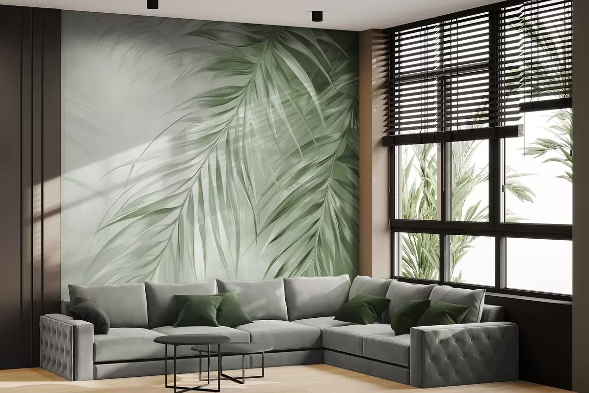 Wall murals Palm leaves with green tones, light textured background with soft colors, elegant tropical style Nr. w09475v2