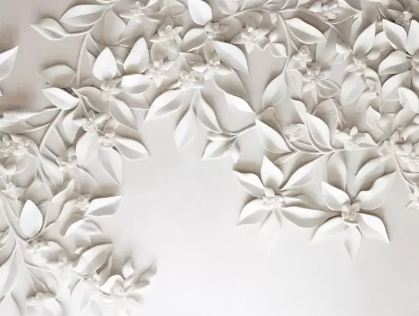 Wall murals White textured flowers and leaves, floral arrangement , elegant design, minimalist style, decorative art Nr. w09479