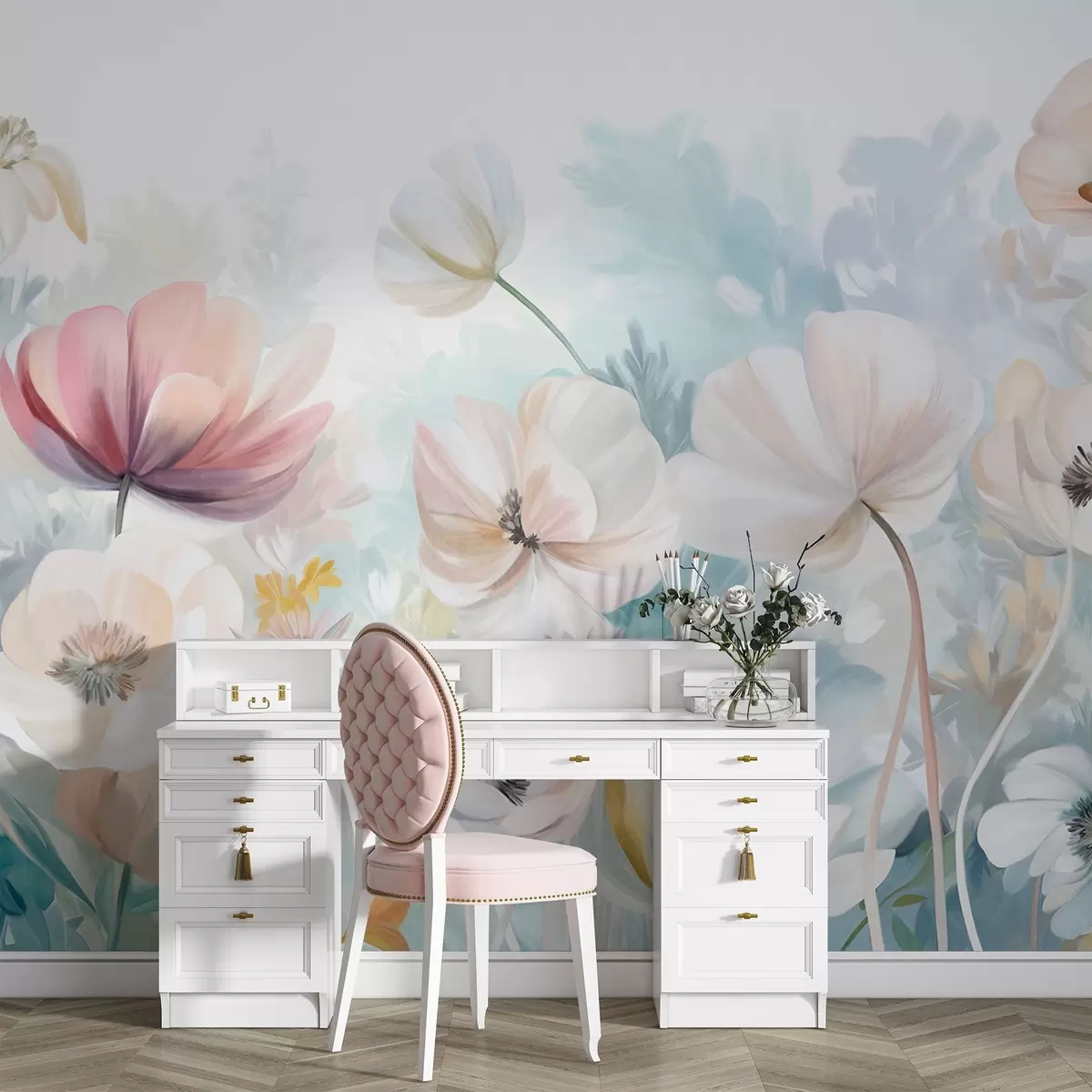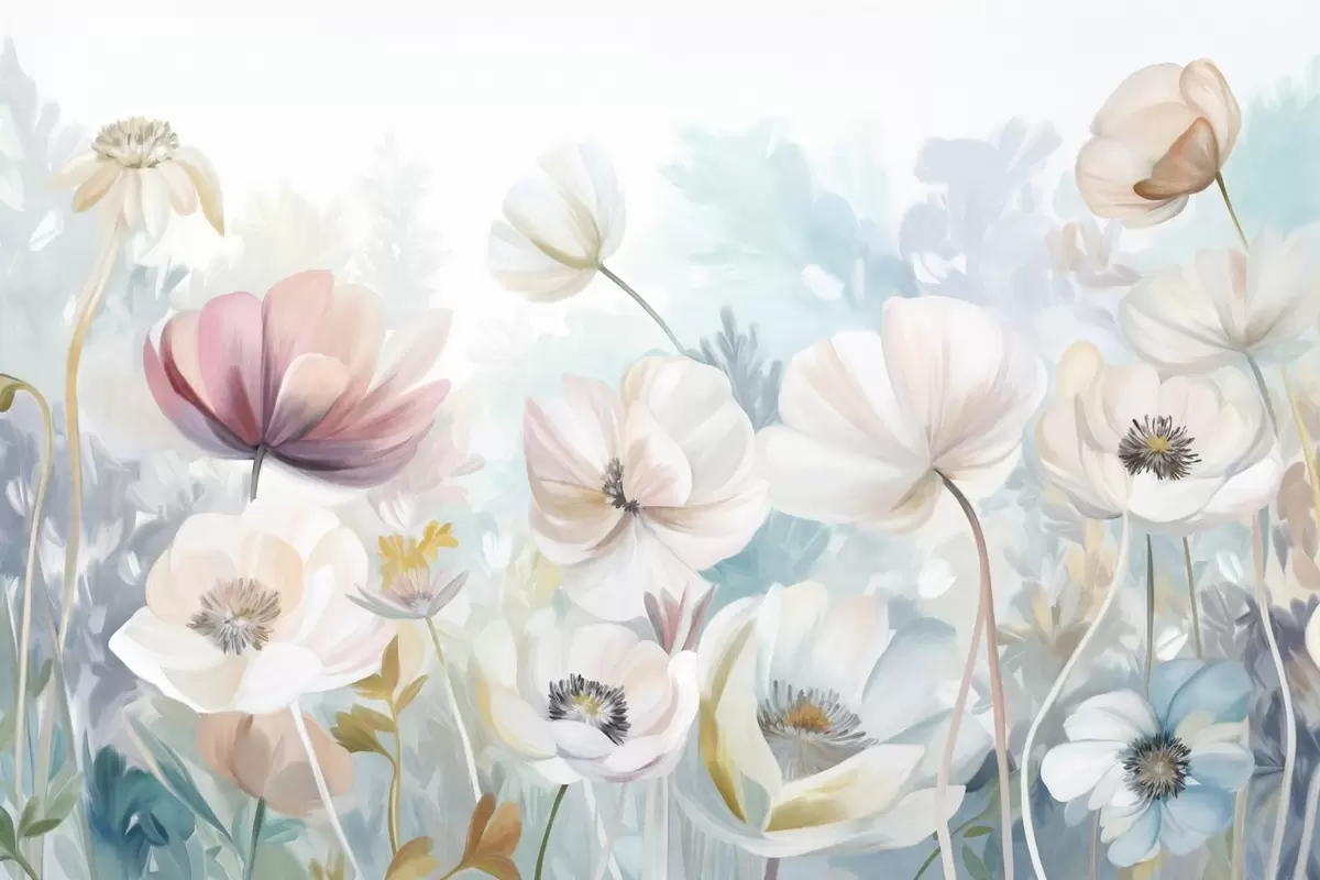 Wall murals A field of pastel-colored flowers with delicate petals, soft green leaves, in a dreamy, textured watercolor style Nr. w09481