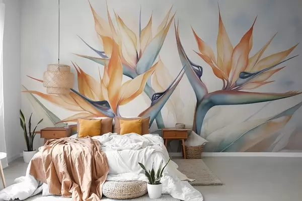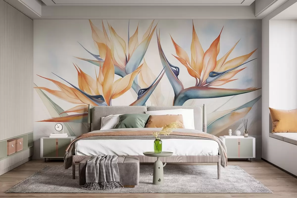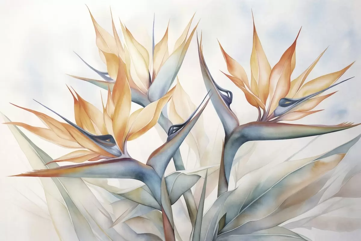 Wall murals Bird of paradise flower, strelitzia with orange petals, soft watercolor textured style, light background Nr. w09483