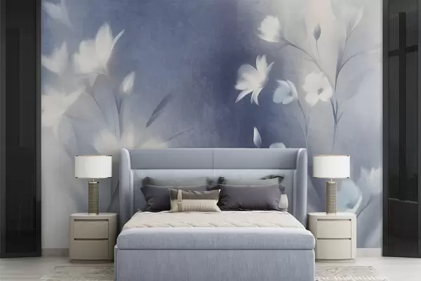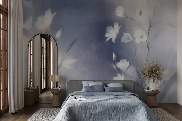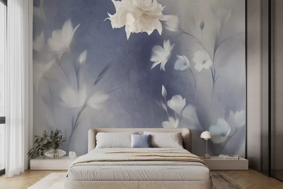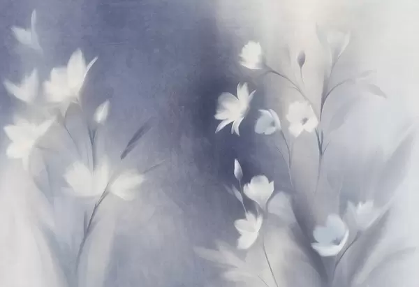 Wall murals White textured flowers with long stems , soft buds against a blurred background of blue and white hues Nr. w09484