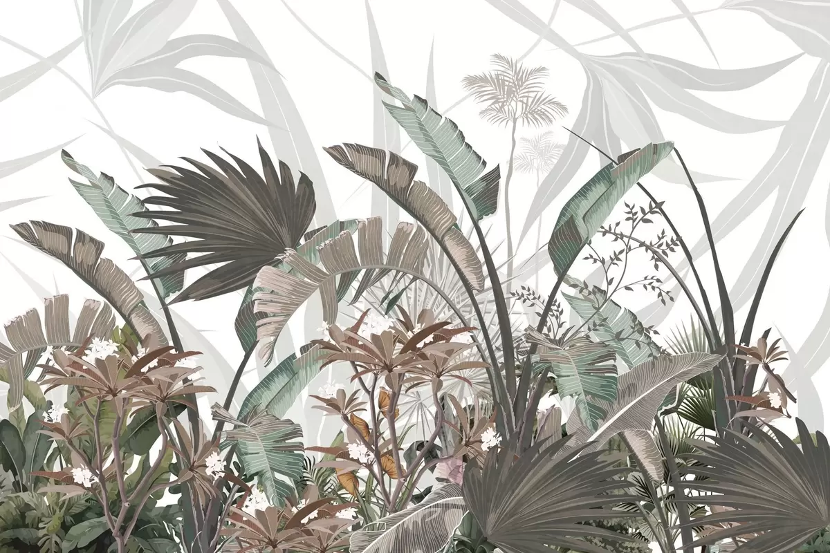 Wall murals Tropical textured leaves with flowers, palm trees , plumeria flowers, pastel colors, white background, jungle Nr. w09488