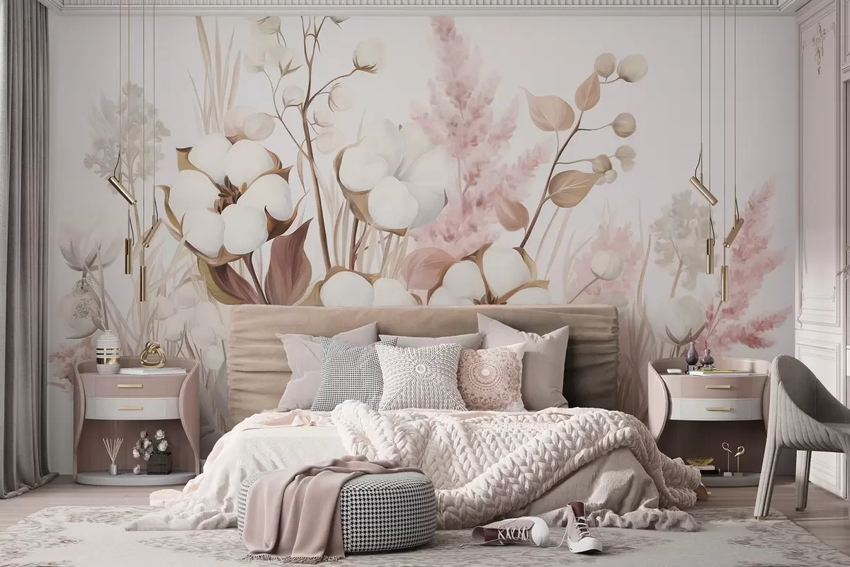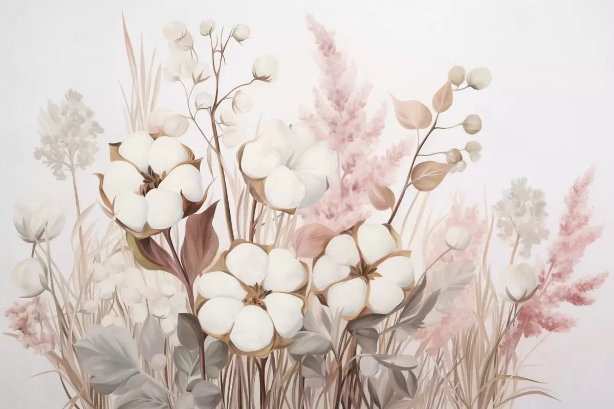 Wall murals Cotton textured flowers with white and pink pampas grass, beige and brown leaves and herbs, white background Nr. w09489