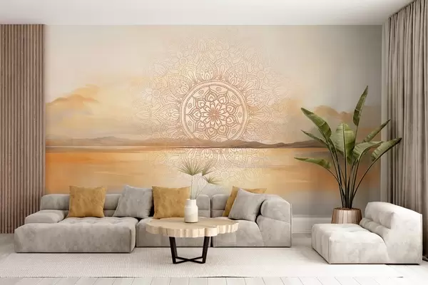 Wall murals Textured symmetrical mandala design overlaying a landscape with a sea, hills and sky, soft pastel colors Nr. w09491