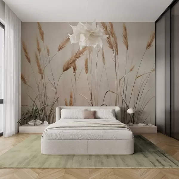 Wall murals Wheat textured field with yellow ears of grain, beige background, natural lighting, warm tones, detailed brushstrokes Nr. w09493