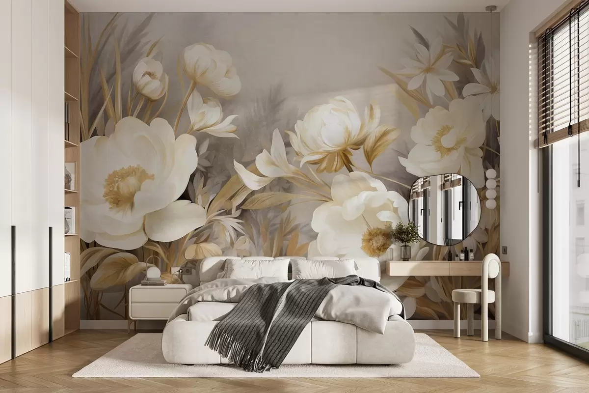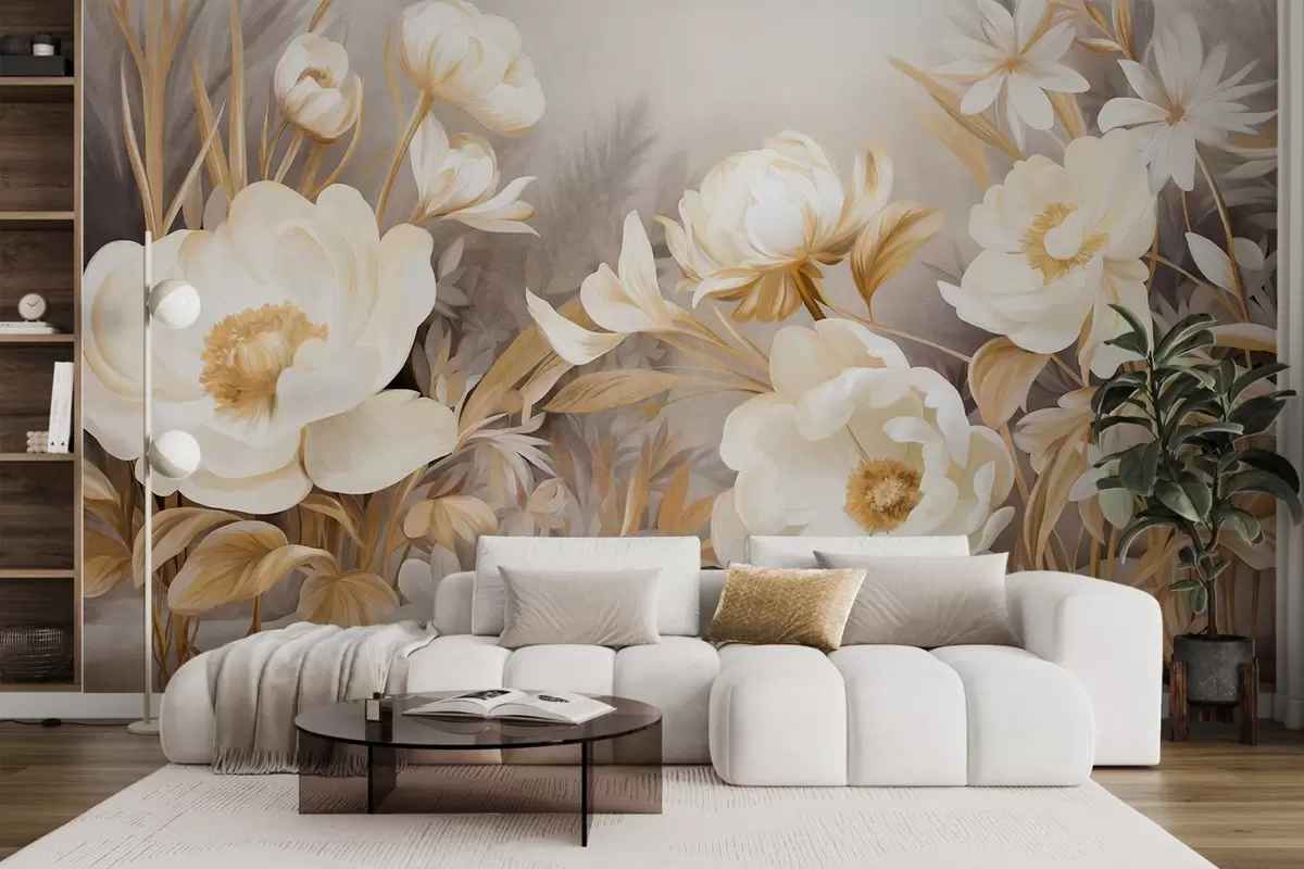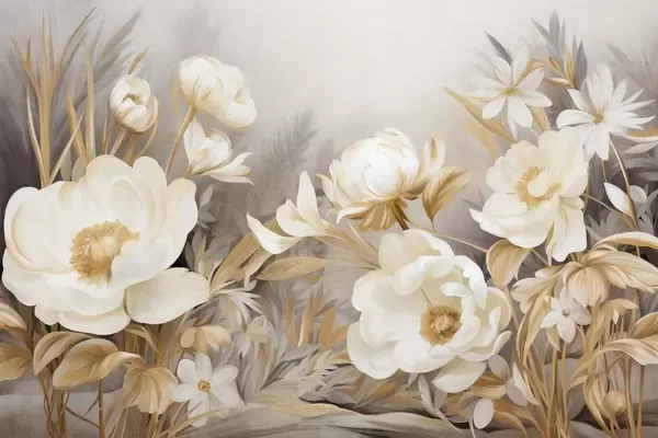Wall murals White and yellow peonies and other flowers with tall grass and leaves in a soft, painterly textured style Nr. w09494