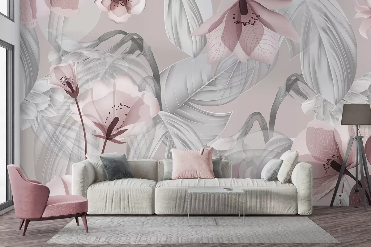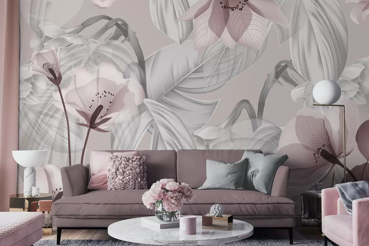 Wall murals Pink flowers and grey leaves, floral botanical background, elegant design, soft colors, light delicate details Nr. w09497