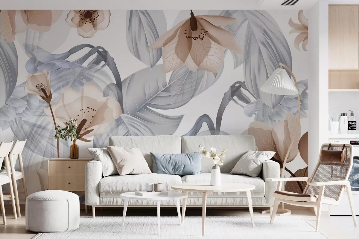 Wall murals Brown flowers and grey leaves, floral botanical background, elegant design, soft colors, light delicate details Nr. w09497v1