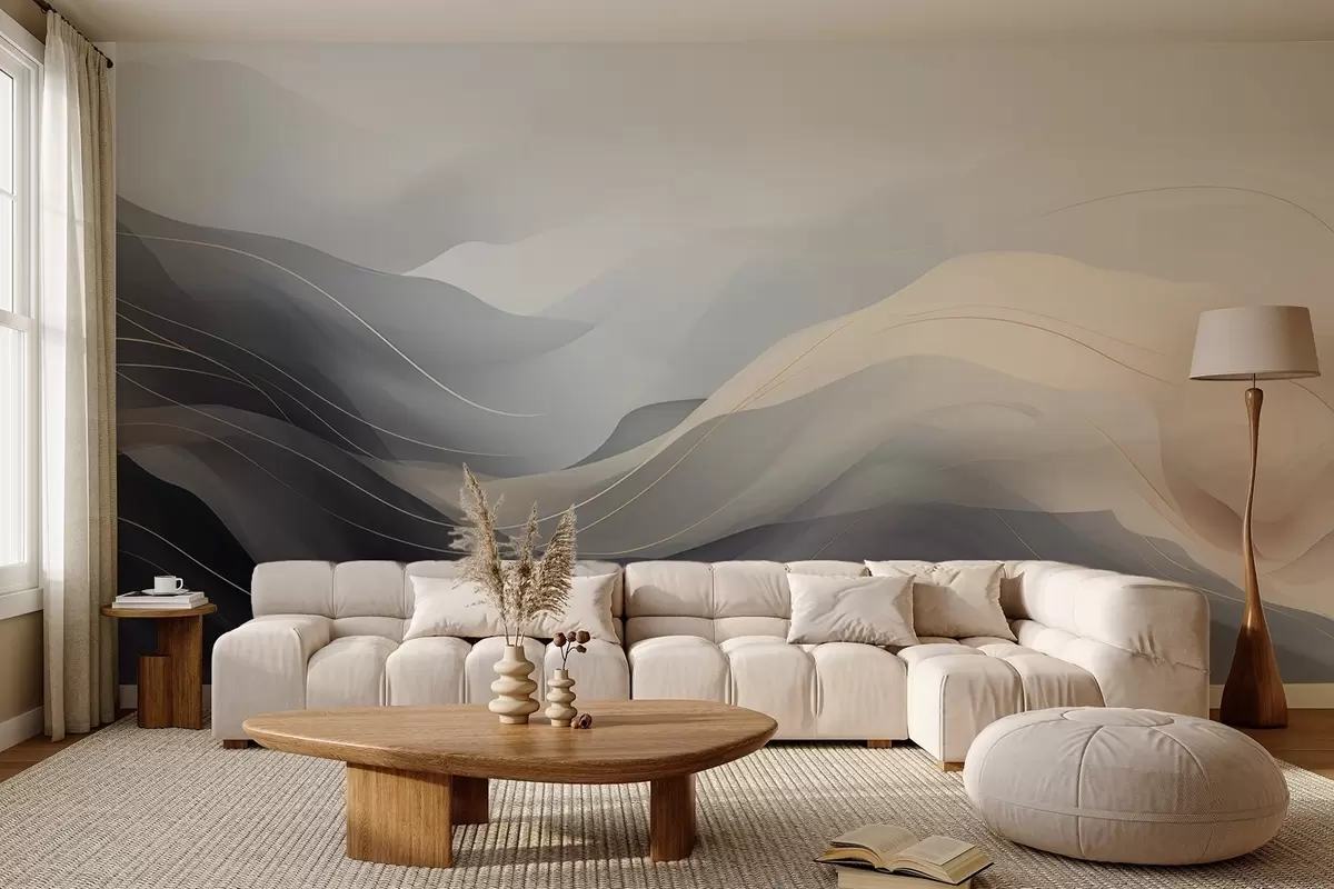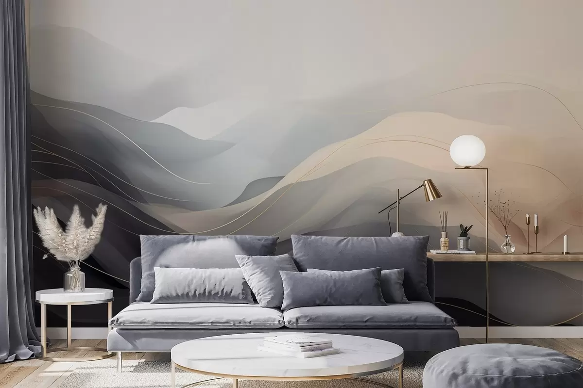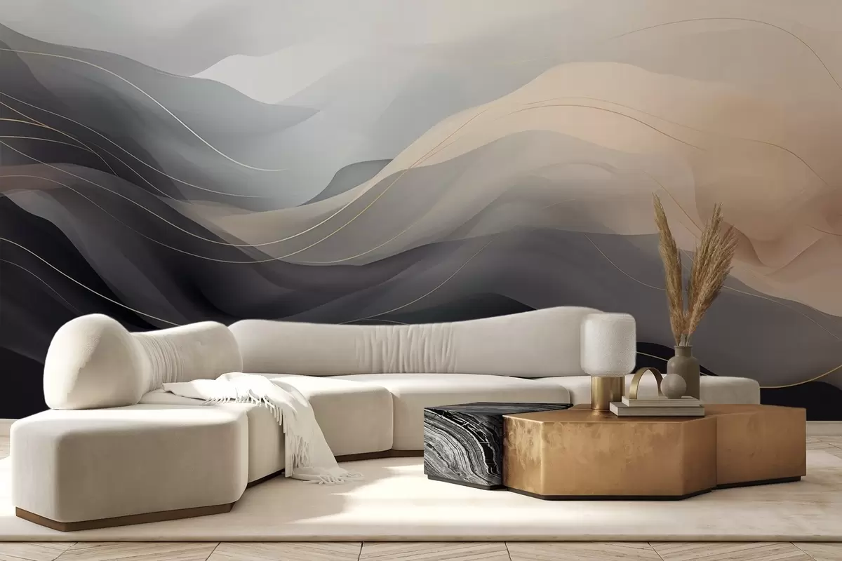 Wall murals Abstract misty waves in gray-cream tones with yellow lines Nr. w09504