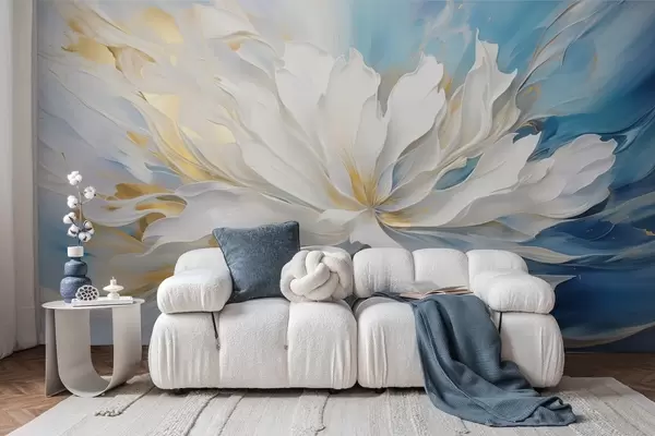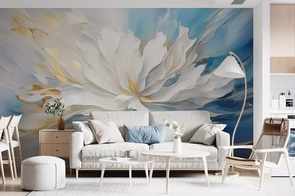 Wall murals Large white peony in oil painting style on a blue-yellow background Nr. w09511