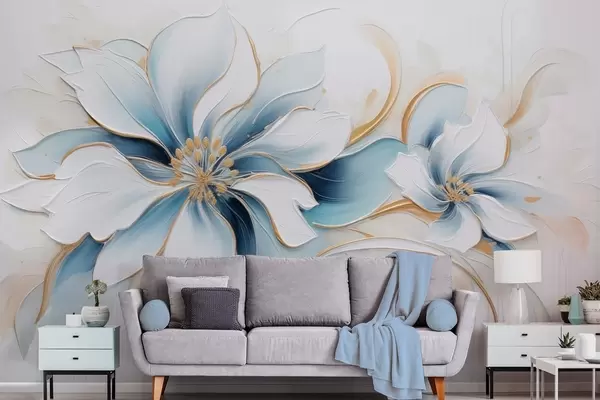 Wall murals Painterly abstraction with blue flowers in oil painting style Nr. w09524