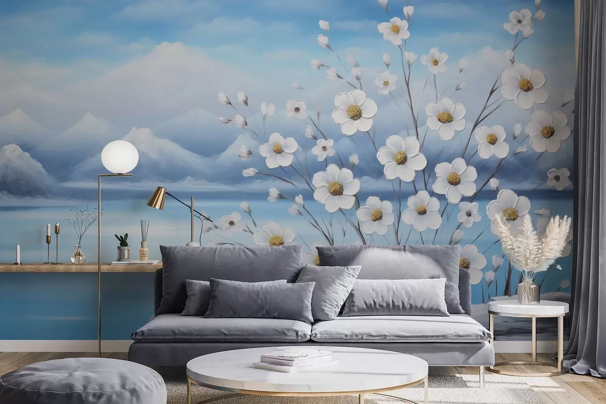 Wall murals White spring flowers by an icy lake with snowy mountains in oil-painting style Nr. w09526