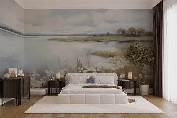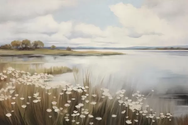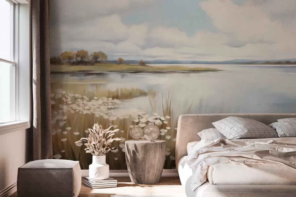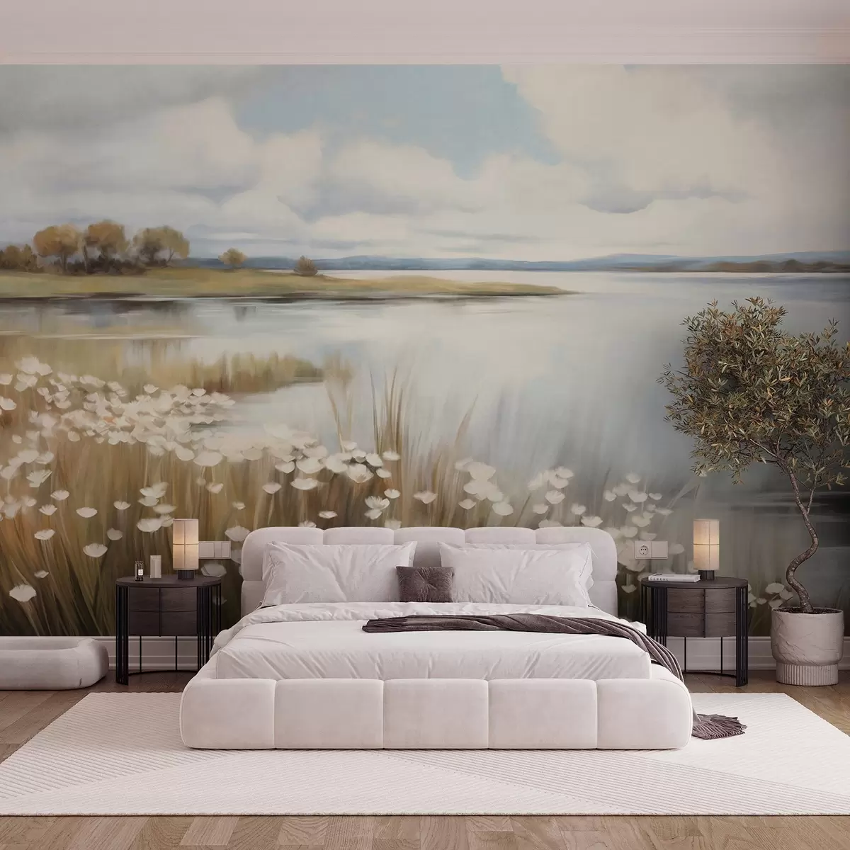 Wall murals Textured landscape, field of white flowers and tall grass, a lake in the background, a grassy hill with trees, soft colors Nr. w09530