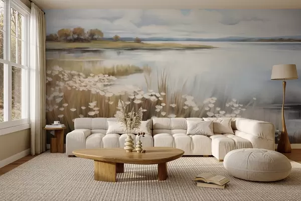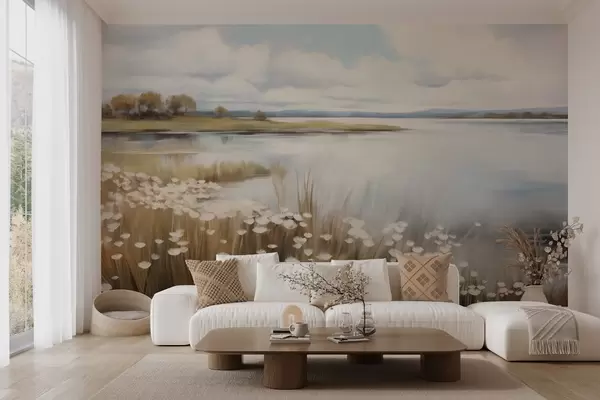 Wall murals Textured landscape, field of white flowers and tall grass, a lake in the background, a grassy hill with trees, soft colors Nr. w09530