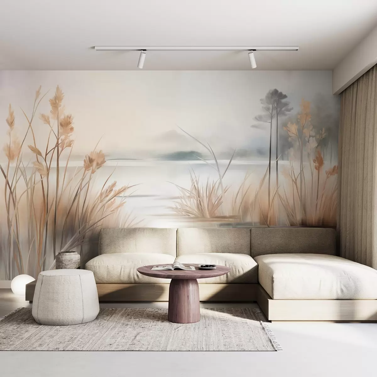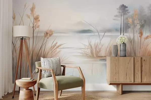 Wall murals Landscape with a lake and tall grass in the foreground, mountains in the background, soft colors, textured Nr. w09534