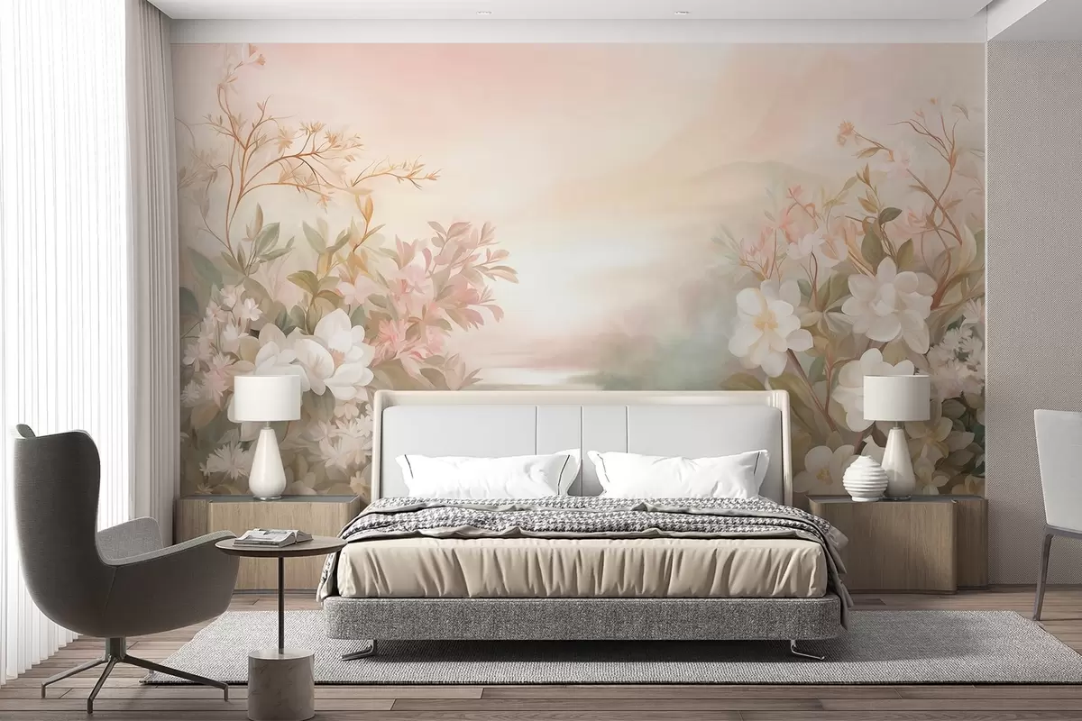 Wall murals A landscape with a river surrounded by flowers and plants, soft colors, pink sky, watercolor textured style Nr. w09537