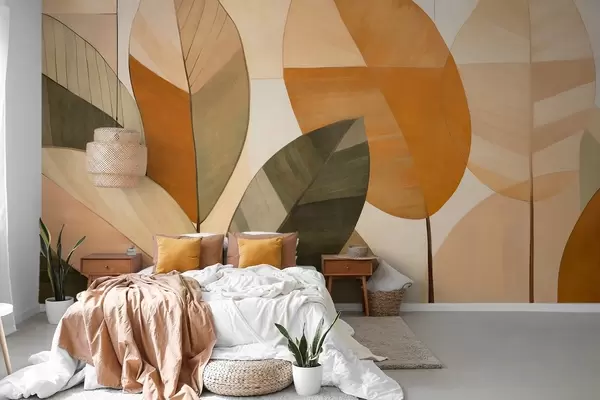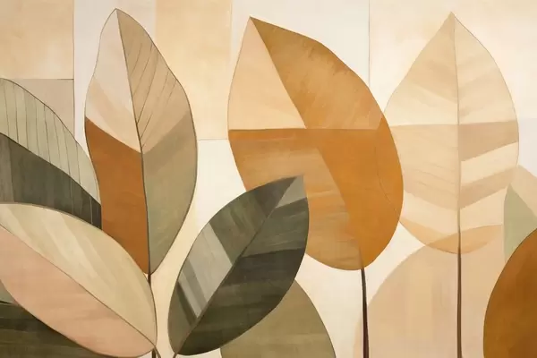 Wall murals Abstract large leaves in shades of orange, brown and green, textured, arranged against a light background Nr. w09539