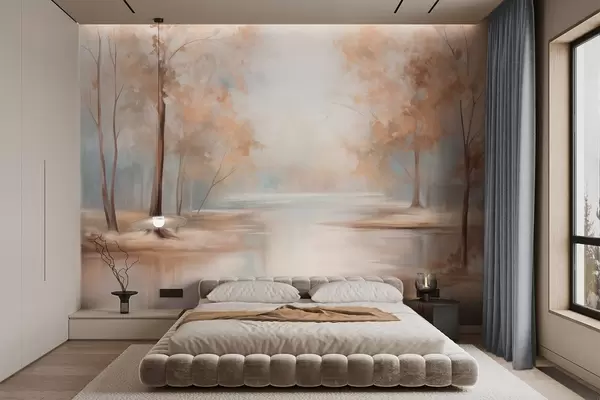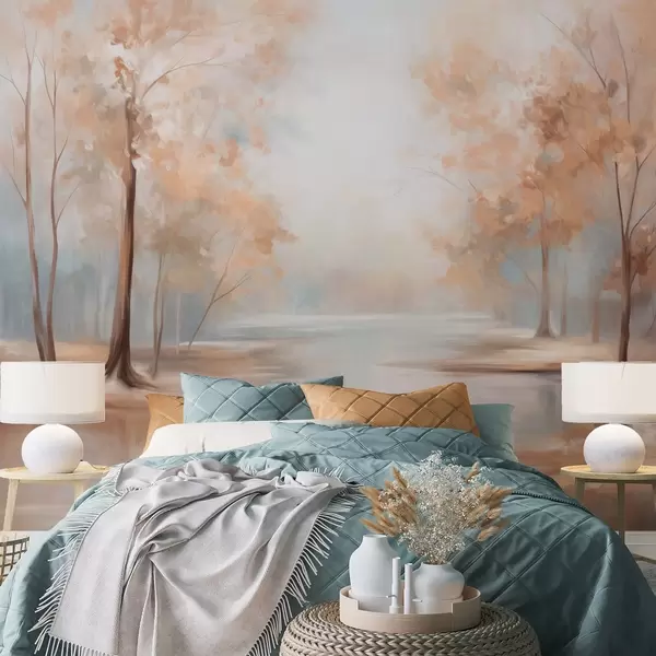 Wall murals Autumn textured landscape with trees and a river, soft colors, light and airy atmosphere, peaceful and tranquil scene Nr. w09541