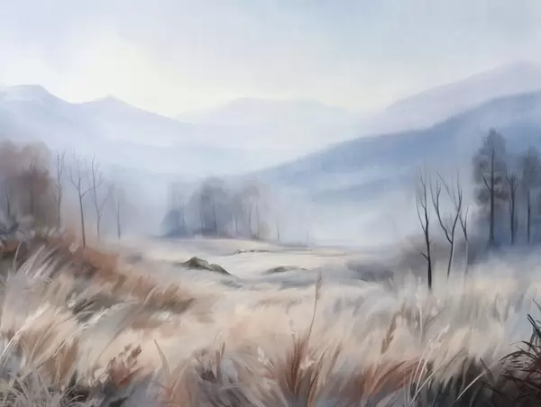 Wall murals Textured landscape with dry grass in the foreground and trees in the background, with distance mountains Nr. w09542
