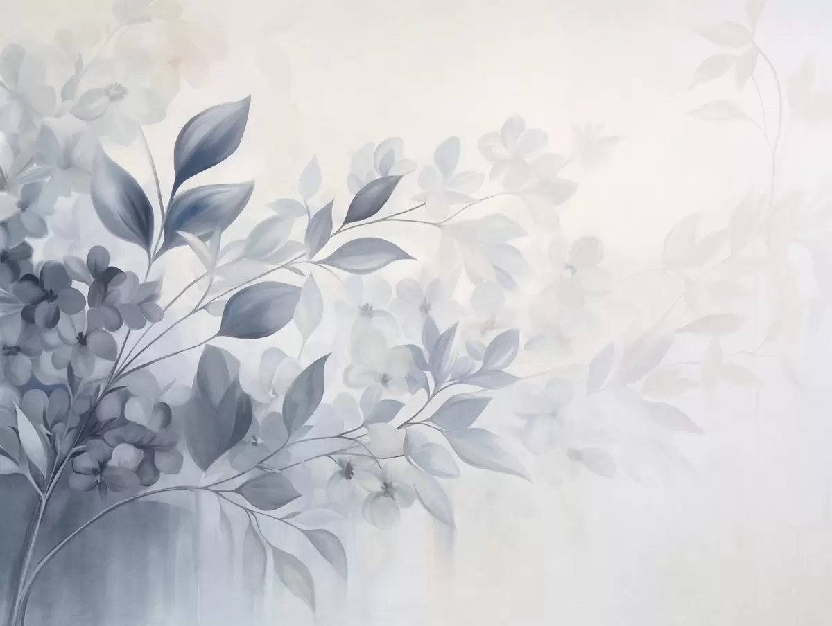 Wall murals Textured blue and white branch with flowers and leaves fading into a light background watercolor painting style Nr. w09543