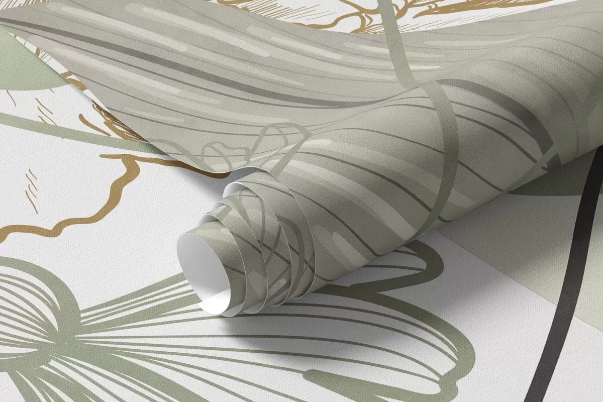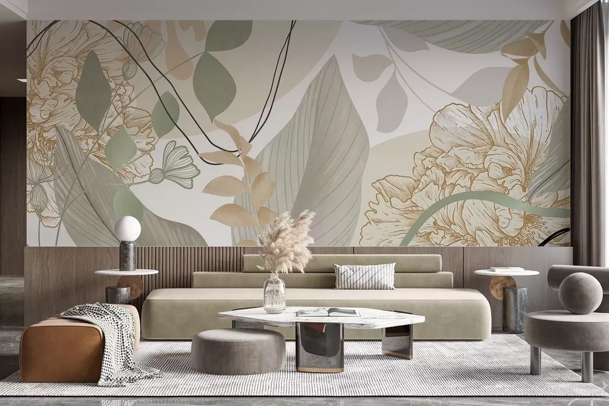 Wall murals Abstract floral print with large leaves in shades of muted green and yellow with thin black lines and white floral outlines Nr. w09544v2