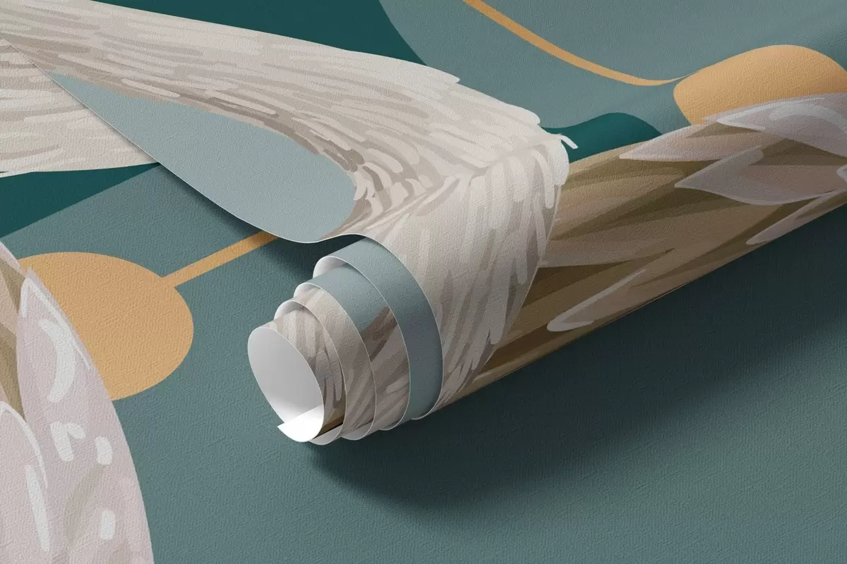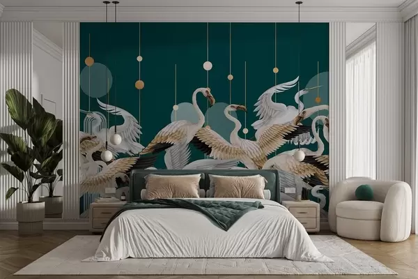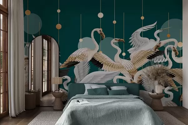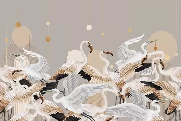 Wall murals A flock of white flamingos with delicate wings, against a dark teal background with yellow lines and circles Nr. w09546