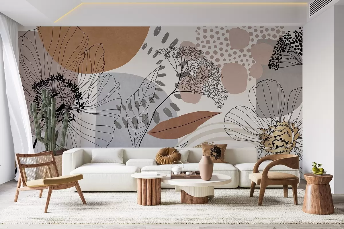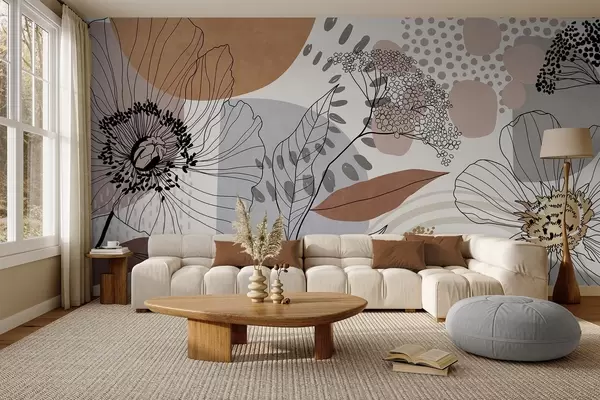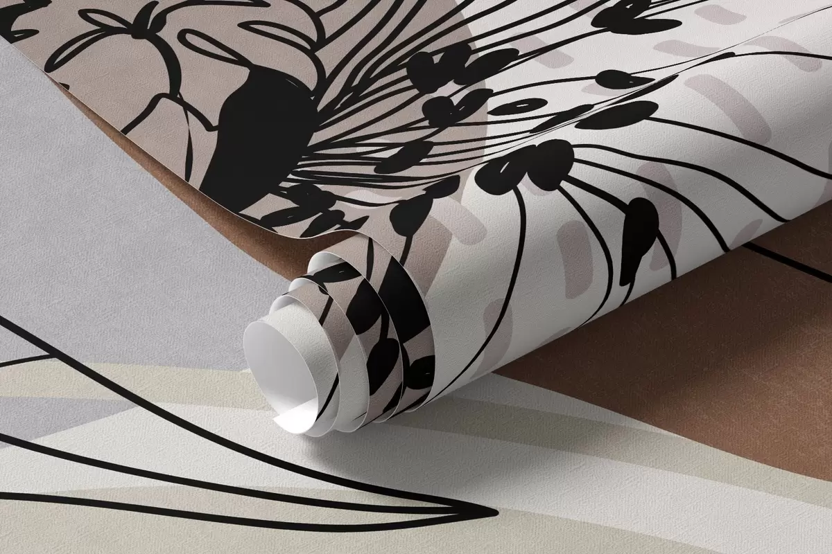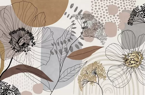 Wall murals Abstract floral textured print with line art flowers, leaves and organic shapes in muted brown, beige and gray tones Nr. w09548