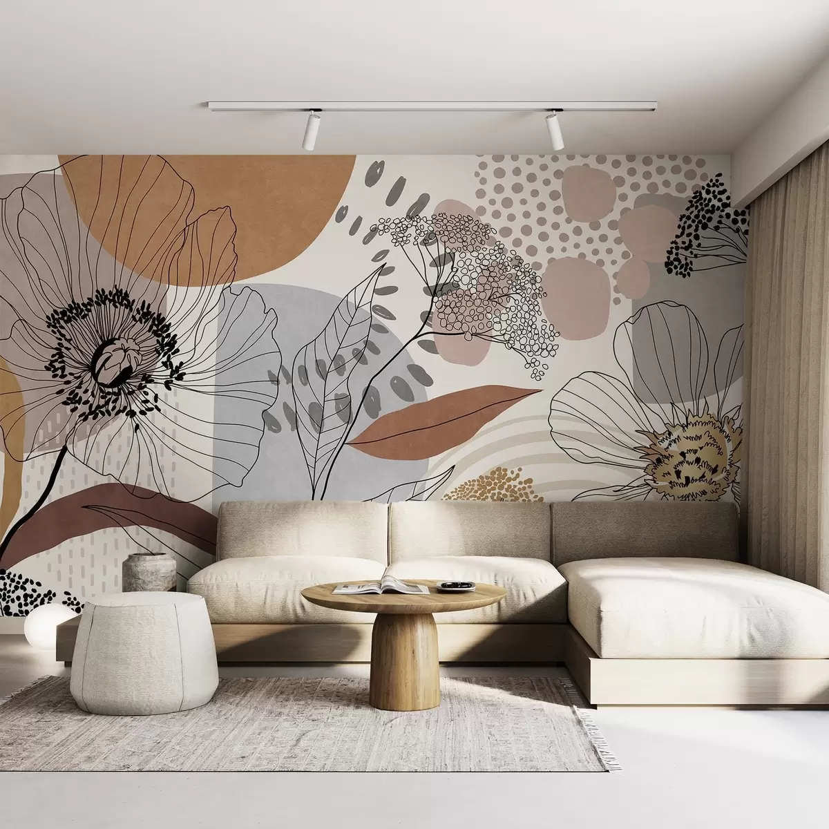 Wall murals Abstract floral textured print with line art flowers, leaves and organic shapes in muted brown, beige and gray tones Nr. w09548