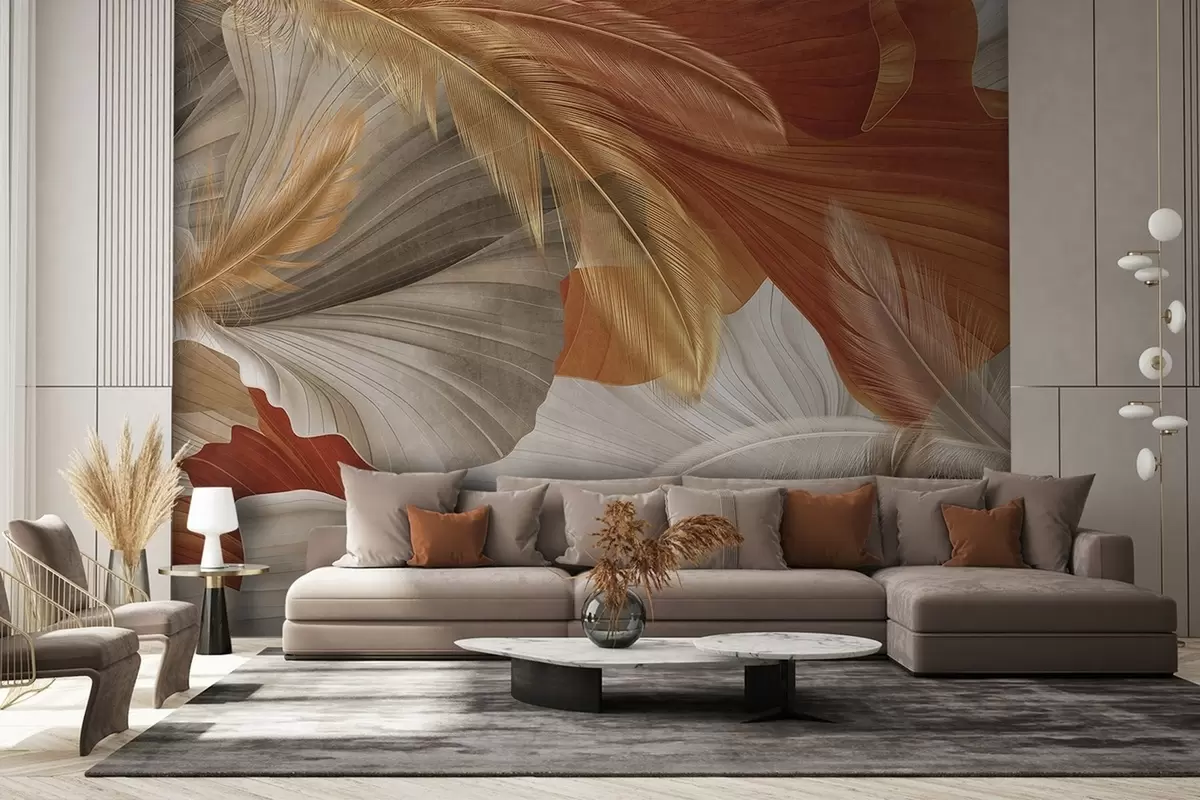 Wall murals Abstract textured large flowing shapes in cream and rust colors with delicate, yellow, beige and brown feathers Nr. w09549