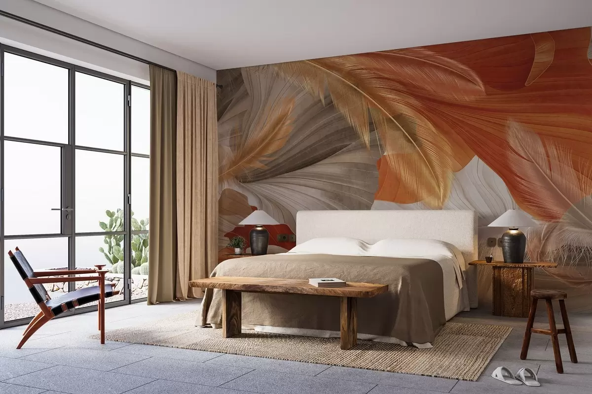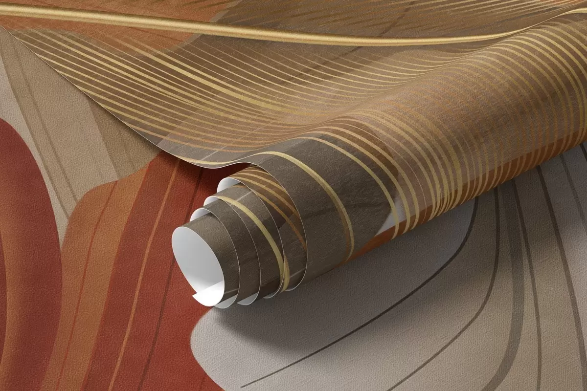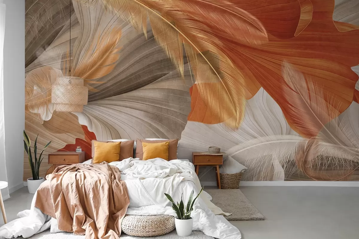 Wall murals Abstract textured large flowing shapes in cream and rust colors with delicate, yellow, beige and brown feathers Nr. w09549