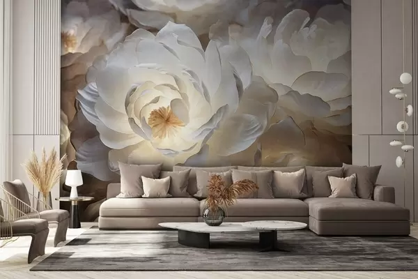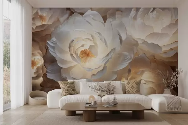 Wall murals Large, white fantasy peony flowers with yellow centers, soft lighting, and delicate, textured layered petals Nr. w09550