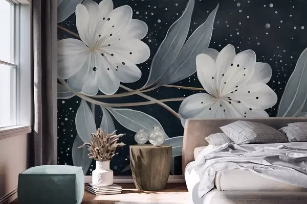 Wall murals Fantasy textured white flowers, surrounded by blue-green leaves and branches against a dark background Nr. w09551