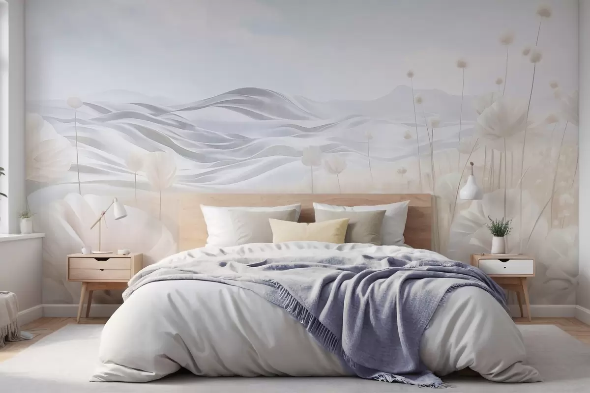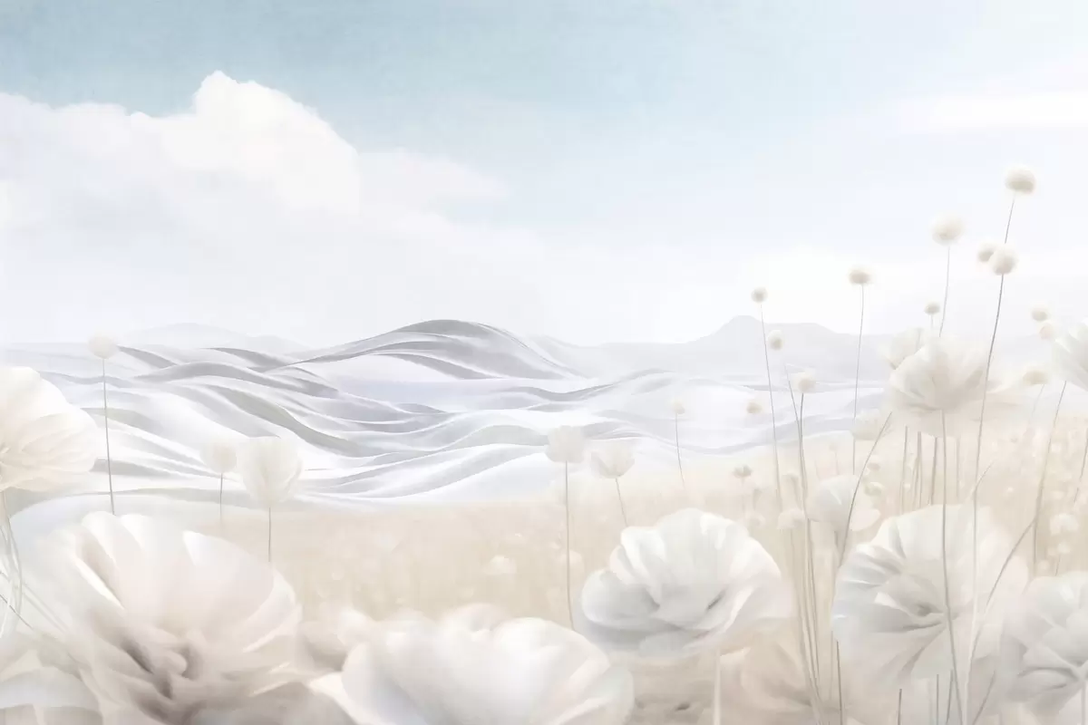 Wall murals Textured field of creamy poppies with rolling hills under a pale blue sky with soft clouds, pastel colors Nr. w09553