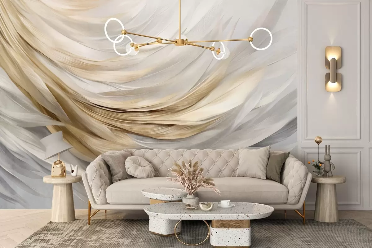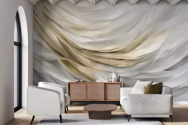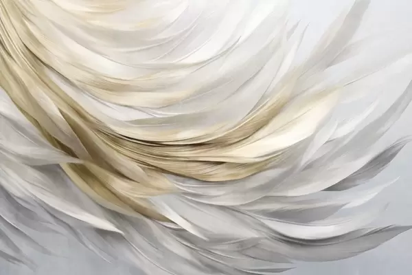 Wall murals Abstract textured white, gray and yellow feathers, creating a flowing, layered pattern against a light background Nr. w09557
