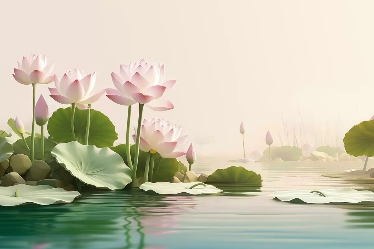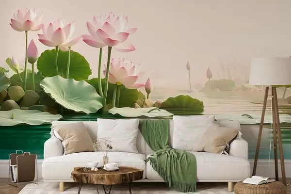 Wall murals Pink lotus flowers on water, a calm tropical landscape Nr. w09561