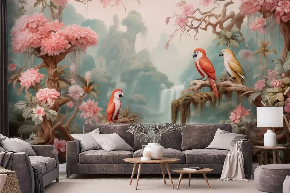 Wall murals A fairytale tropical forest with parrots, flowering trees with pink blossoms, and a waterfall Nr. w09580