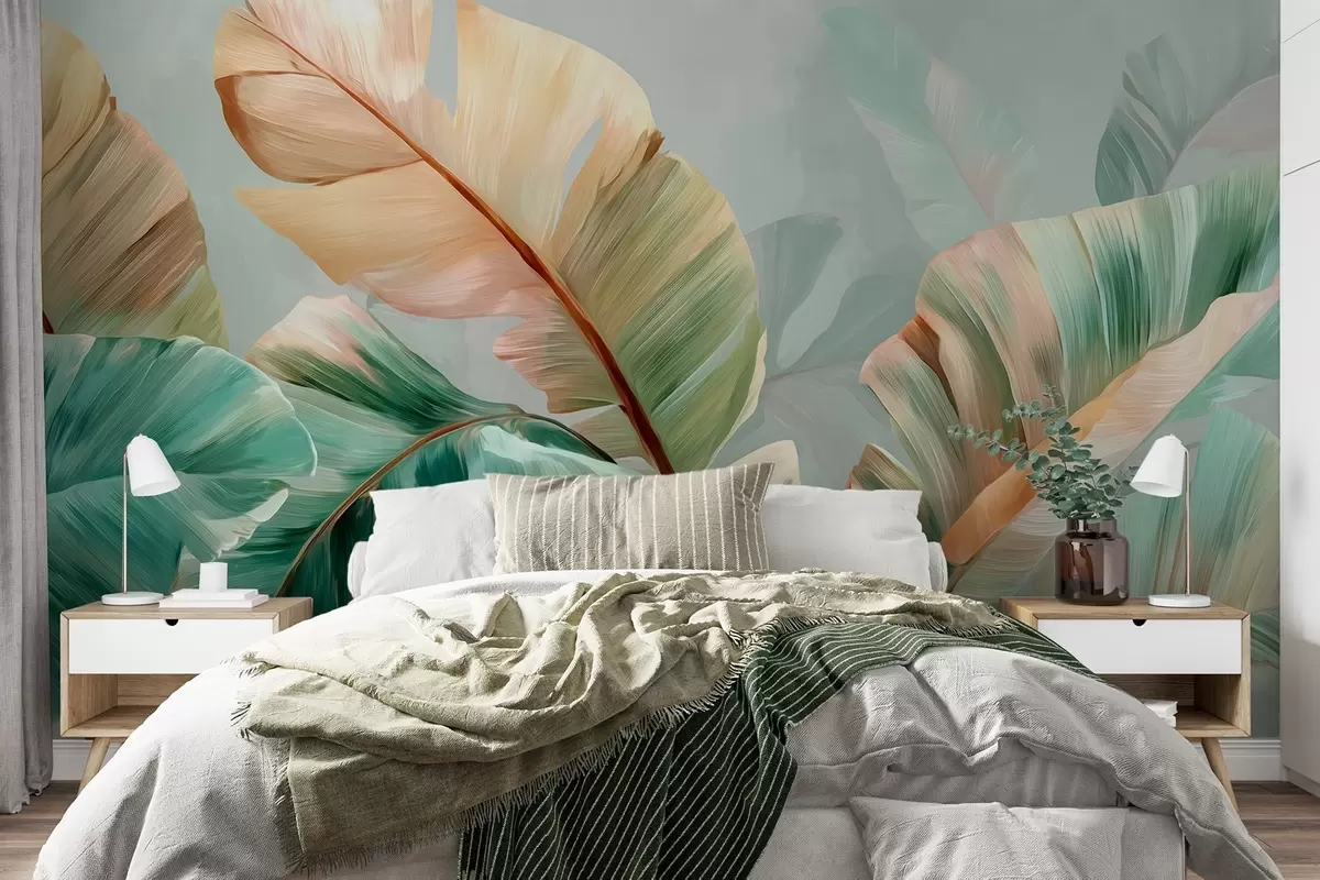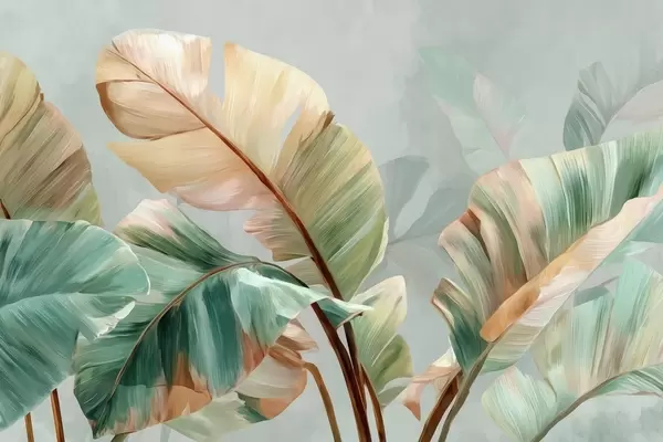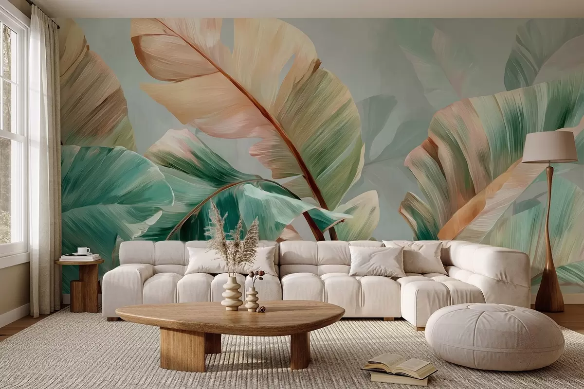 Wall murals Delicate tropical banana leaves in pastel yellow-green tones Nr. w09581