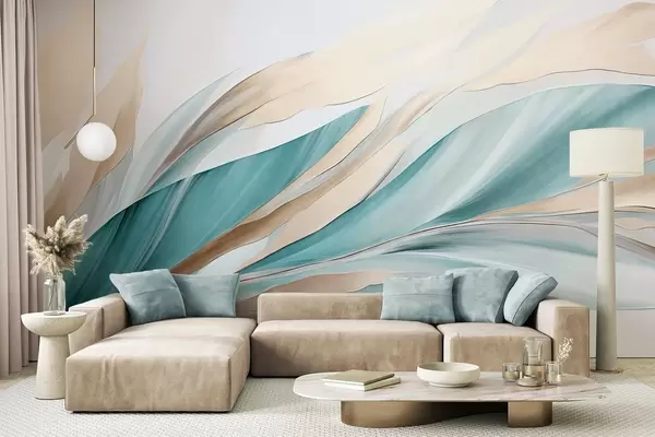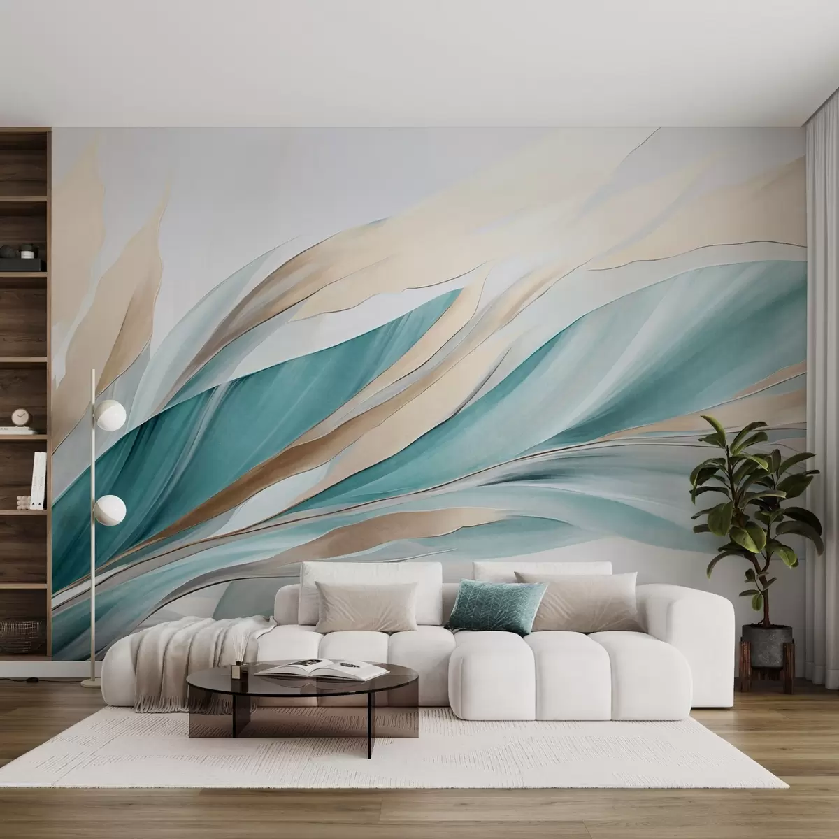 wall murals Abstract flowing waves of teal and yellow, with thin shapes and lines, against a white background, textured art w09585