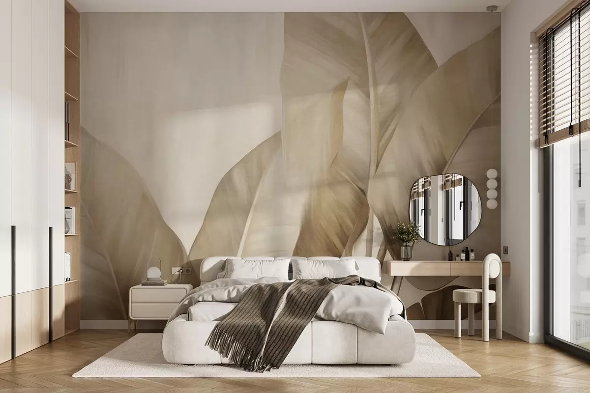 Wall murals Textured large, light brown banana leaves against a light beige background, with soft and minimalist aesthetic Nr. w09586