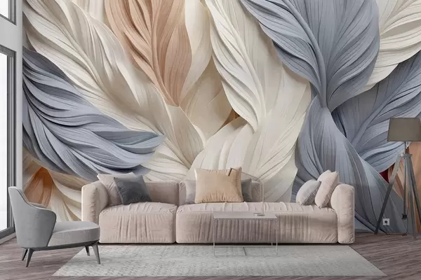 Wall murals Abstract, layered feathers in cream, beige, and light blue hues, with a textured, organic appearance Nr. w09603