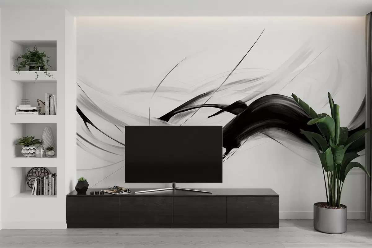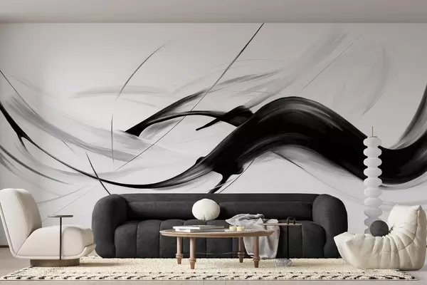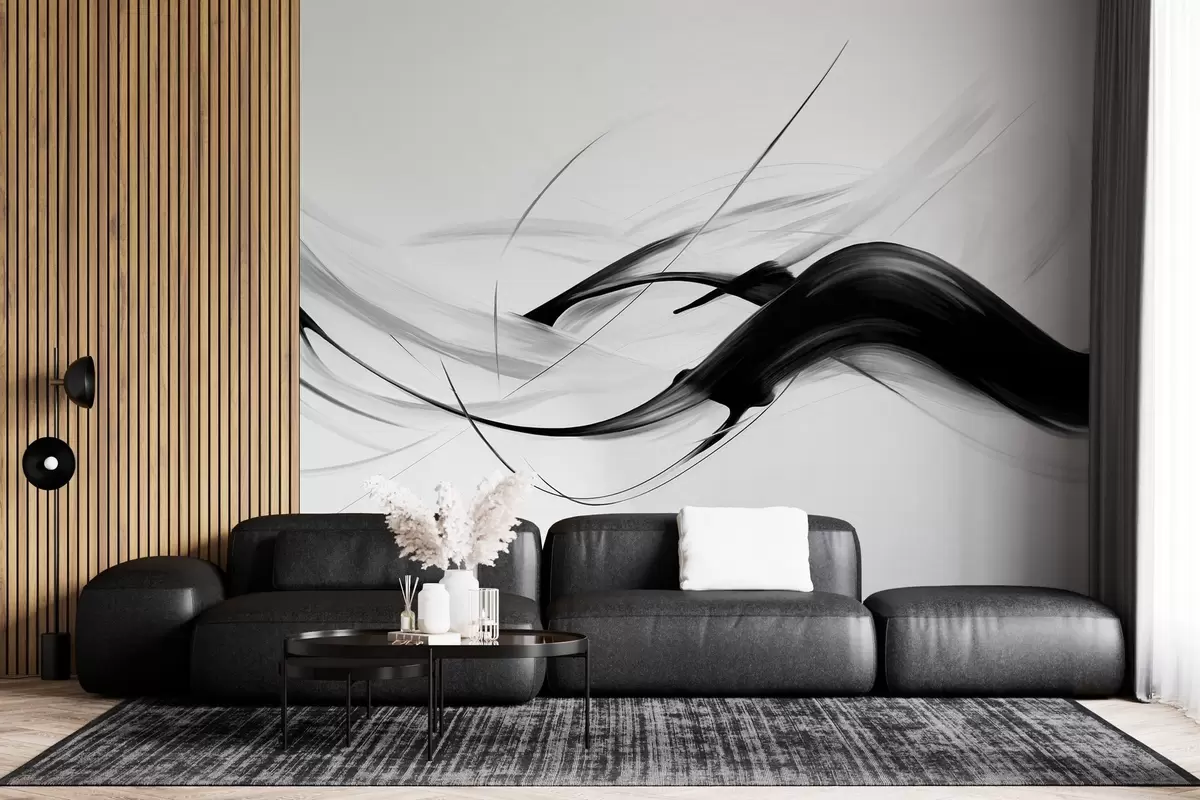 Wall murals Abstract black and white brush strokes with thin lines creating a modern design against light background Nr. w09605