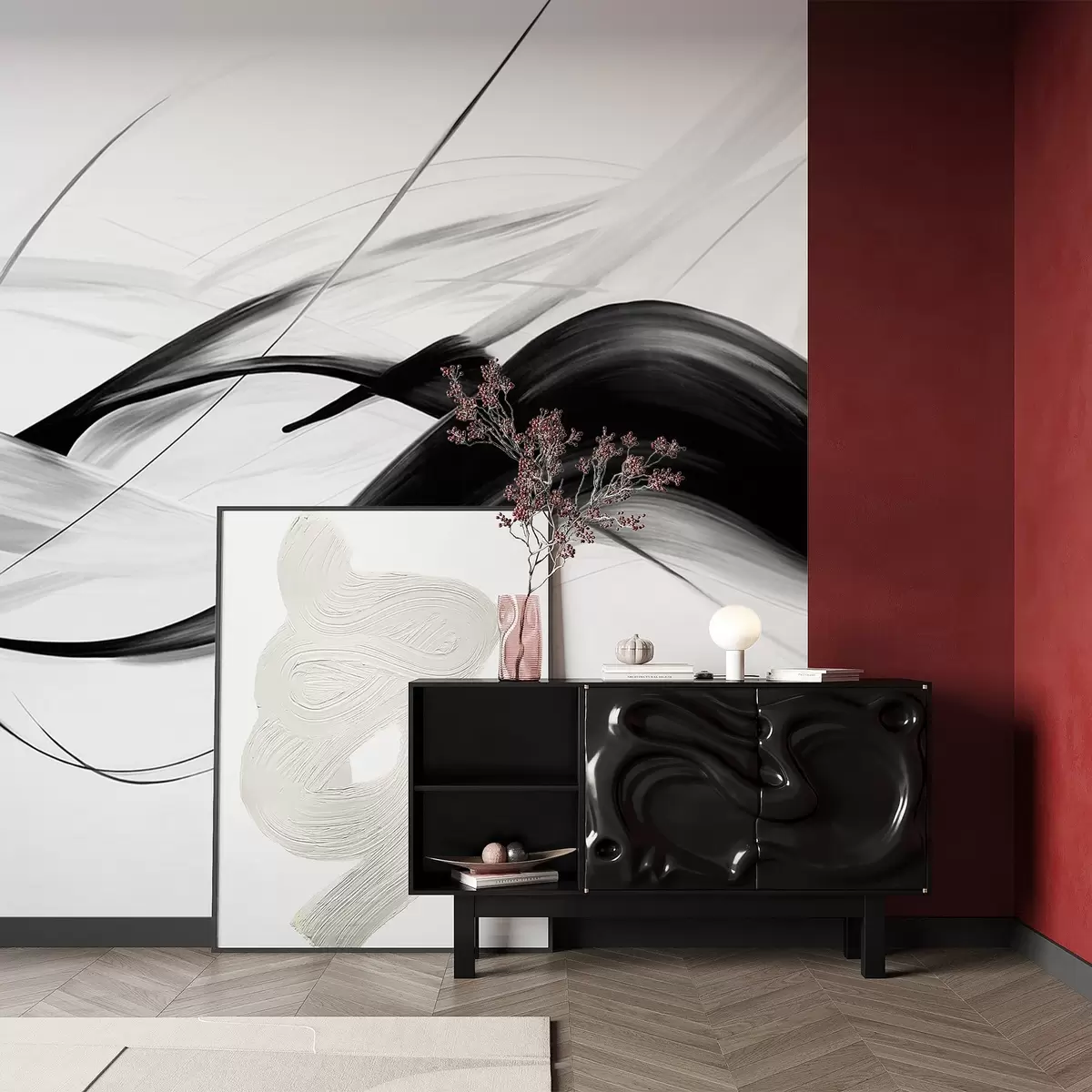 Wall murals Abstract black and white brush strokes with thin lines creating a modern design against light background Nr. w09605
