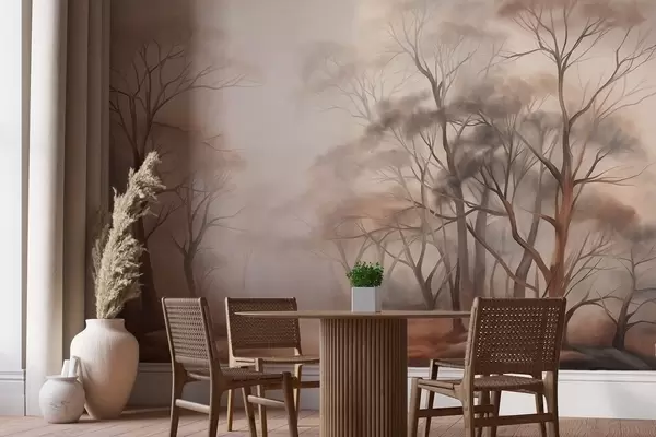 Wall murals Textured trees in a hazy woodland, foggy landscape with subdued muted colors and gentle lighting Nr. w09609