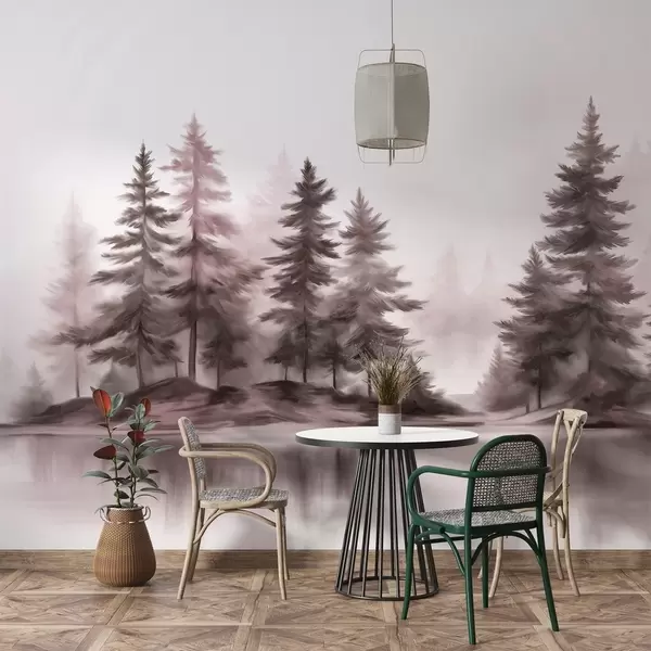 Wall murals A textured foggy forest with tall pine trees painting imitation Nr. w09610v1