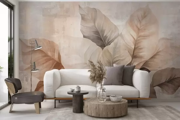 Wall murals Textured painting imitation of large, light brown leaves against a neutral background with subtle brushstrokes Nr. w09614