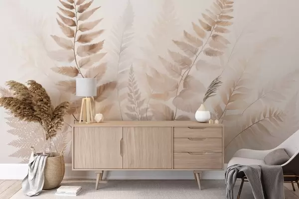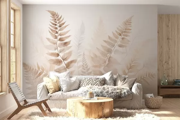 wall murals Textured dried fern fronds in various shades of brown, with a soft, light background in watercolor style w09615