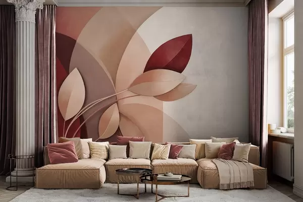 Wall murals Abstract textured branch with leaves in shades of brown, beige and red, against a background of abstract shapes Nr. w09618