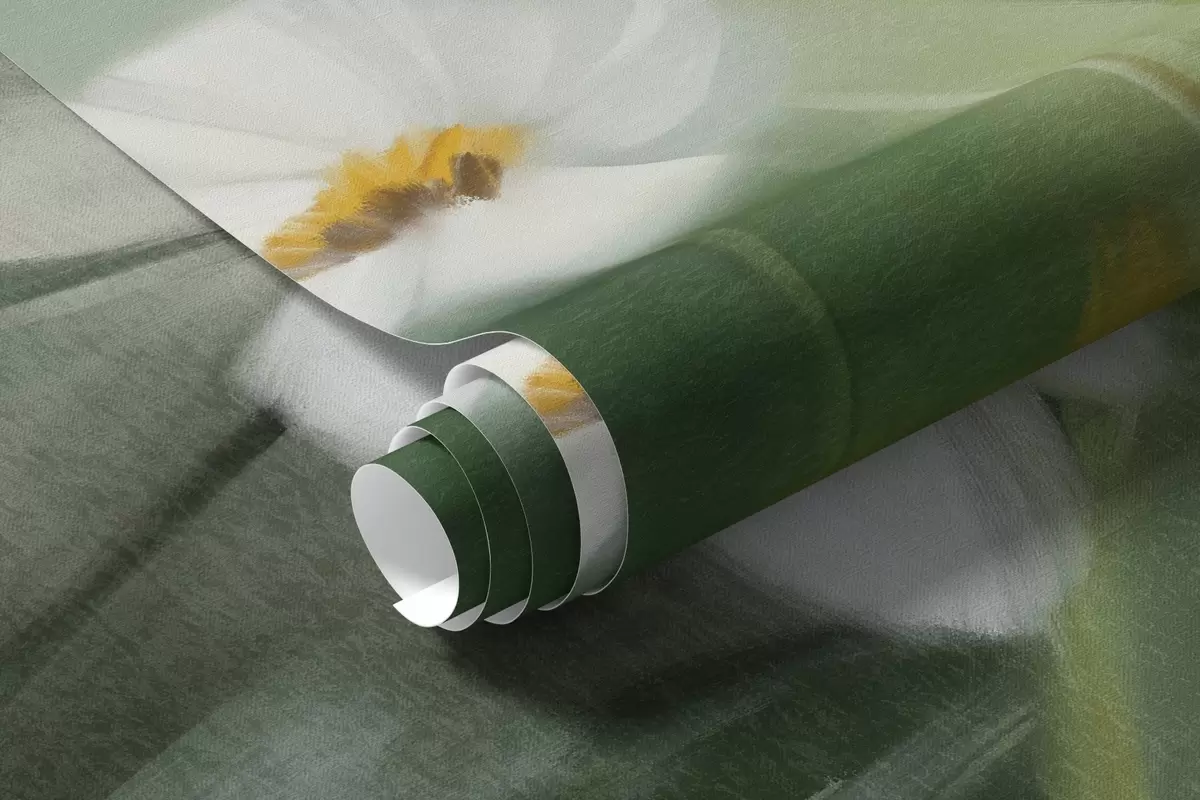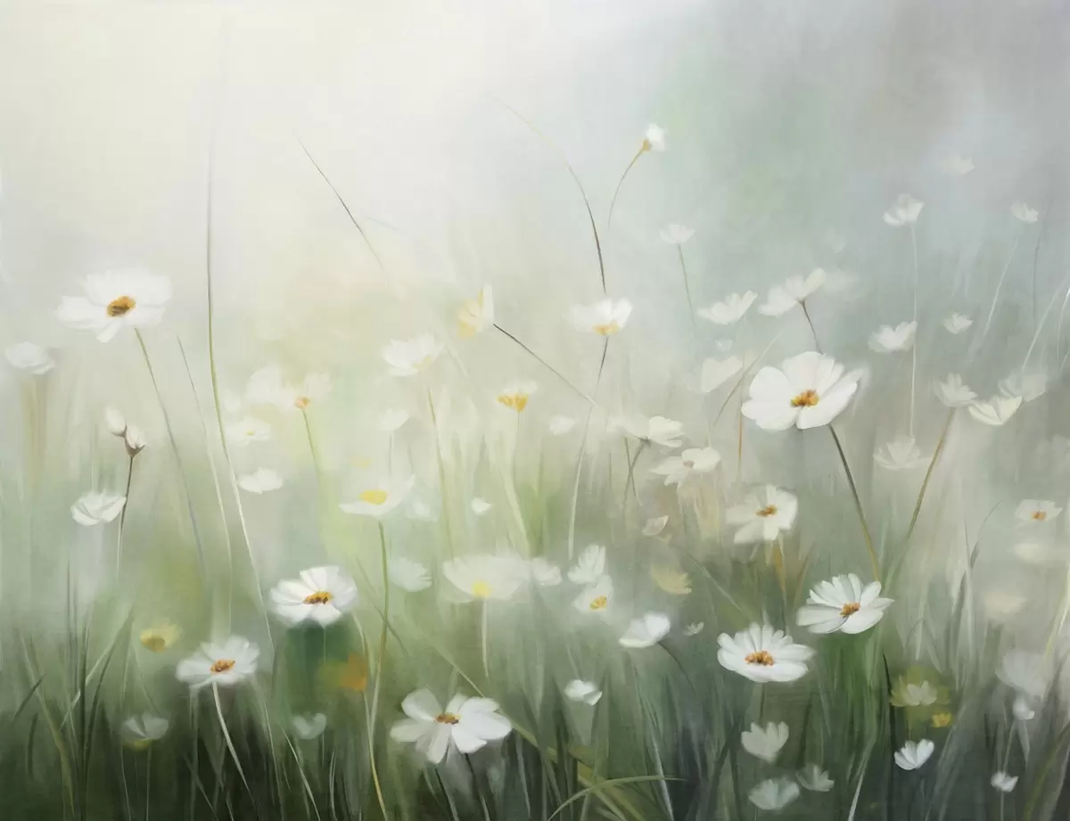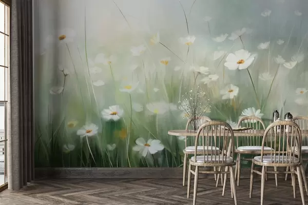 Wall murals Abstract field of white daisies with green grass and a soft, hazy background in painting style Nr. w09619