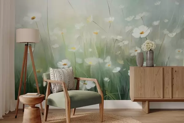 Wall murals Abstract field of white daisies with green grass and a soft, hazy background in painting style Nr. w09619